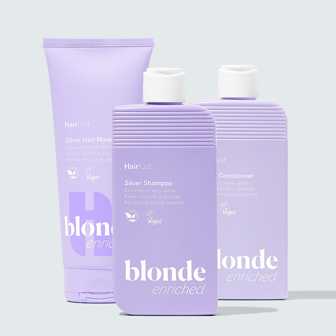 Täydellinen hemmottelupaketti vaaleiden, harmaiden & vaalennettujen hiusten hoitoon! Enriched Blonde™ hopeatuotteet kirkastavat hiusten sävyä, kosteuttavat ja korjaavat. Pakettiin kuuluu kosteuttava hopeashampoo, -hoitoaine ja -hiusnaamio. Vegaanista, pohjoismaista & luonnollista hiustenhoitoa.