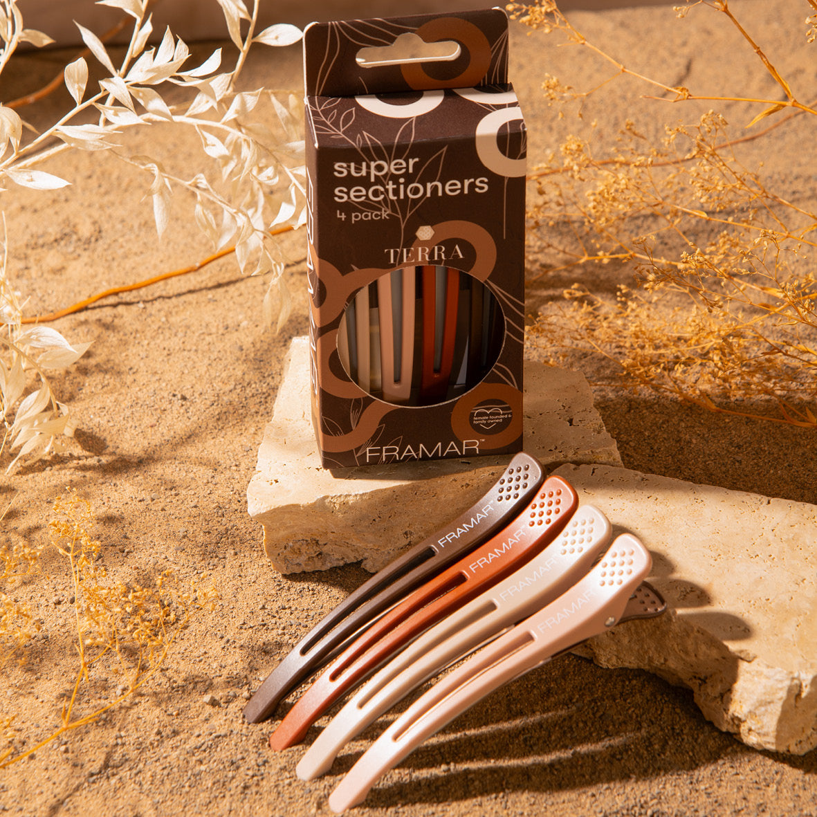 Framarin Super Sectioner-klipseillä jaat hiukset osioihin ilman painaumia. Klipsin napakka, mutta pehmennetty pito pitää sen tiukasti paikallaan silikoniliuskan ansiosta. Kemikaaleja kestävä ja värjäytymätön materiaali.