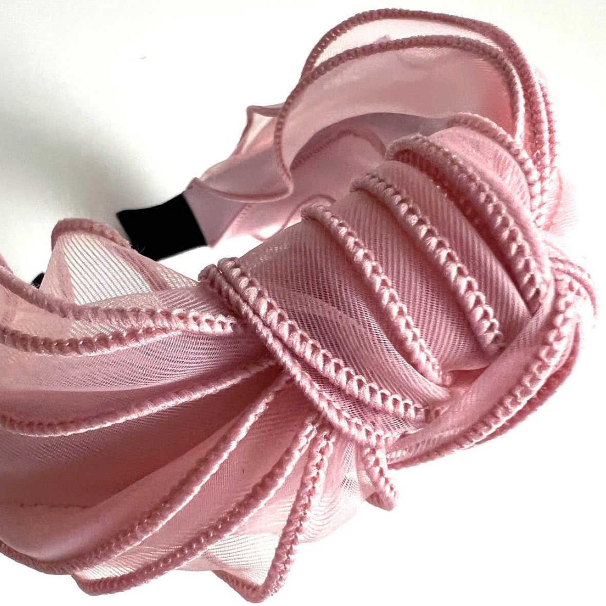 HERTTA-hiuspanta on täydellinen elegantin ja modernin tyylin yhdistelmä. Pannassa on useita kerroksia herkkää, läpikuultavaa vaaleanpunaista harsokangasta, jotka on kierretty ja koristeltu yksityiskohdilla reunoissa, mikä luo visuaalisesti kiehtovan muotoilun.