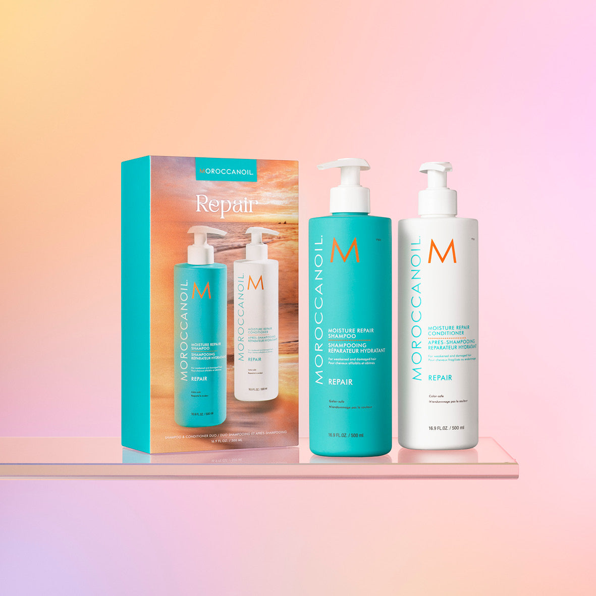 Ihanaan pahvipakkaukseen pakattu Moroccanoil-jättiduo hoitaa ja vahvistaa hiuksia. Pakkaus sisältää suositun Moisture Repair -shampoon ja -hoitoaineen, molemmat 500 ml koossa.